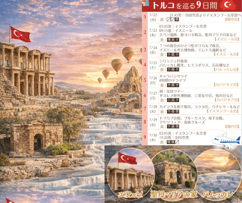 エフェソ(聖書の舞台) 聖母マリアの家 パムッカレ カッパドキア 地下都市 クライマックス カッパドキアの気球 赤塚が世界を巡る中で 「最大の感動」と語る体験。 そして 石のホテル 世界三大料理トルコ料理 トルコNo.1ガイド「ニャット」 これはもう、単なるツアーではない。 “リアルな物語が繰り広げられる舞台”への誘いです。